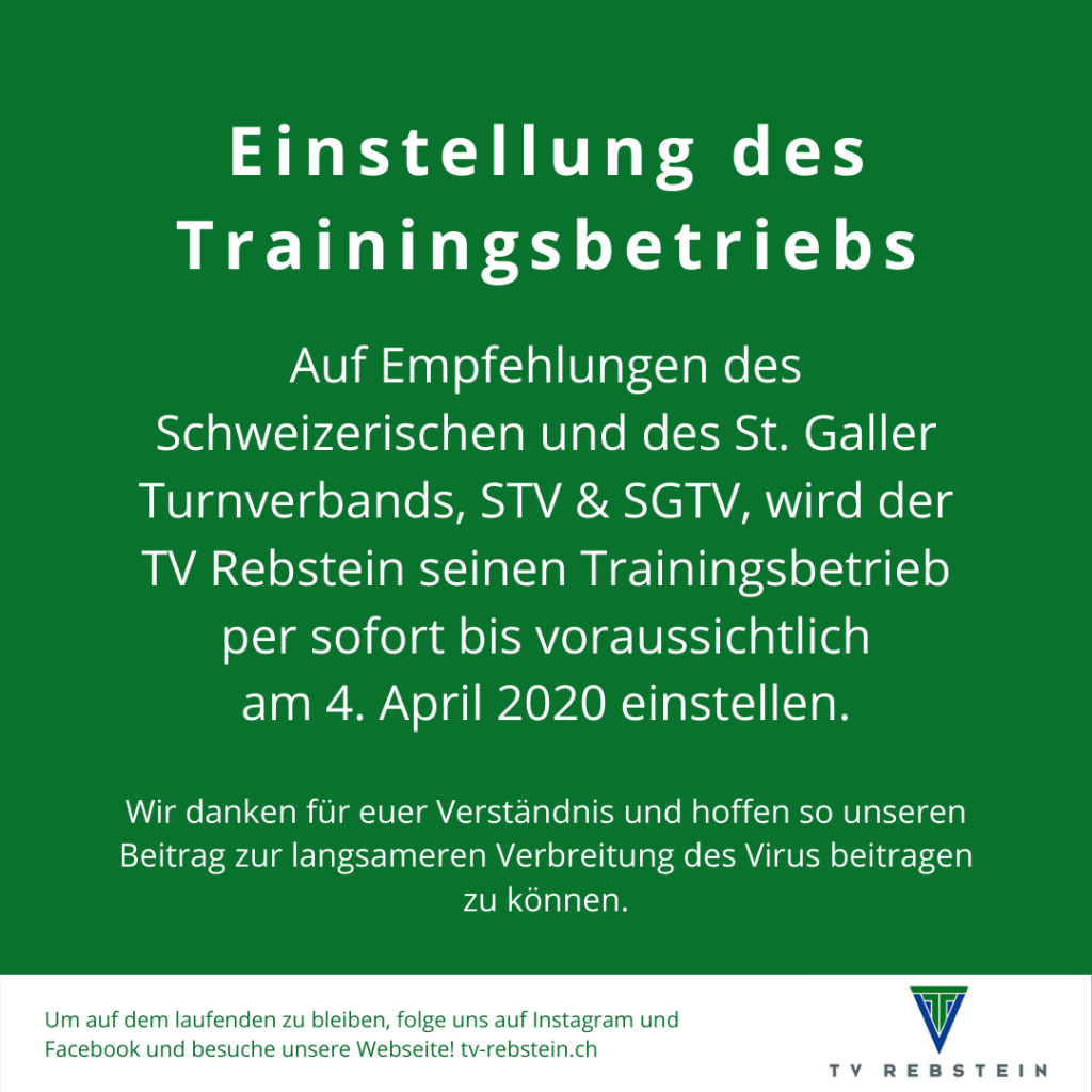 Der St. Galler Turnverband hat in einer Mitteilung empfohlen, den Trainingsbetrieb einzustellen und folgt somit der Empfehlung des Schweizerischen Turnverbandes.